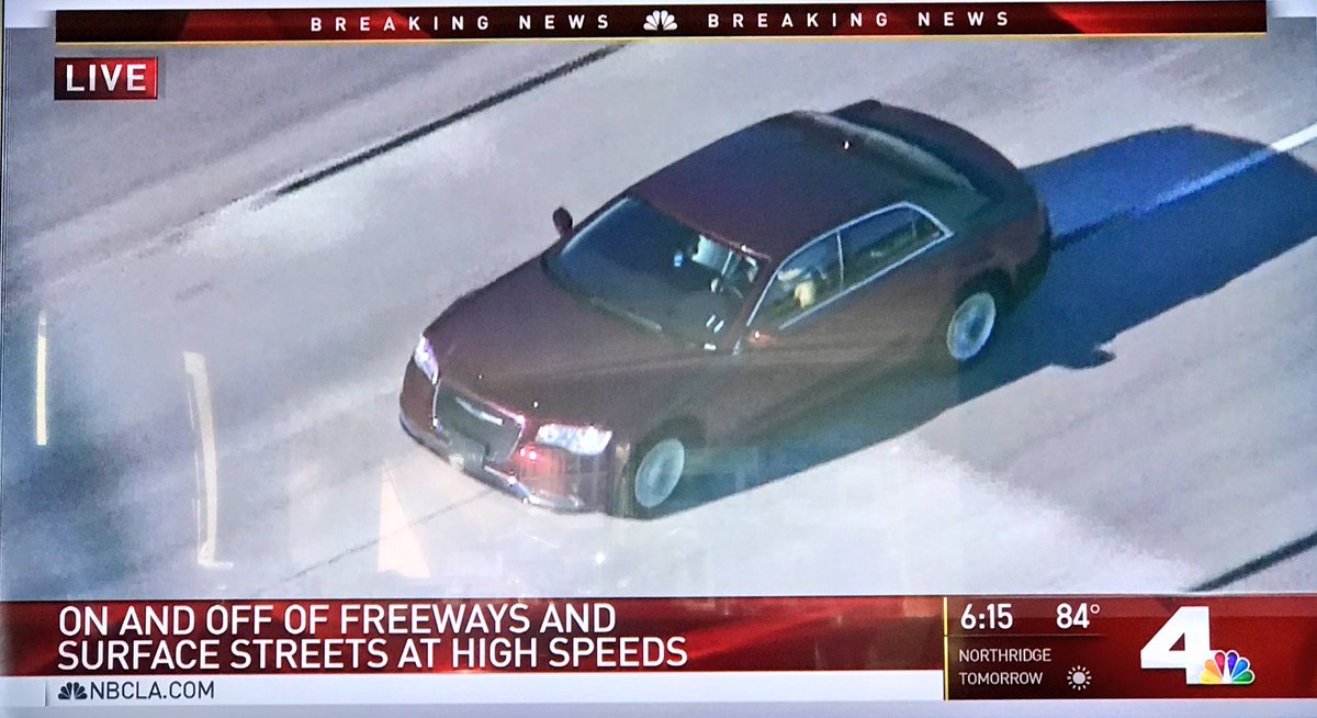 On TV chopper had to break off out of fuel. But at least we know pursuit driver is wearing a tank top, has tattoos & car has air freshener pic.twitter.com/jfEPpuEnZN