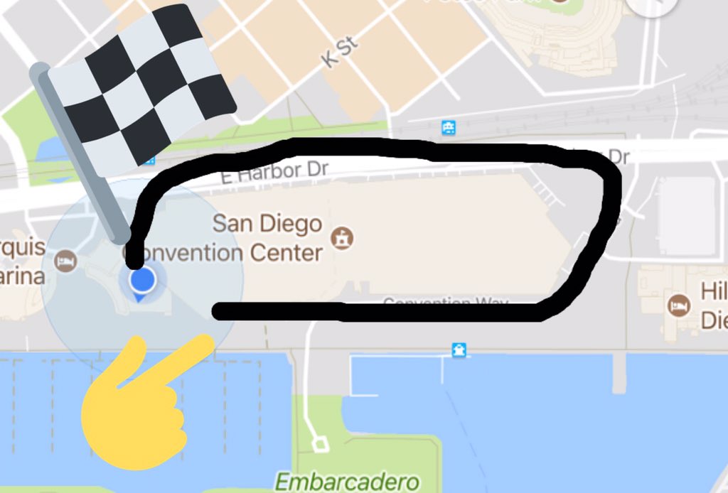 This will be our AT-AT walking route, starting at the hand at 6pm & looping the convention center. Or as far as we make it :) #SDCC pic.twitter.com/q7f4v3AP5W