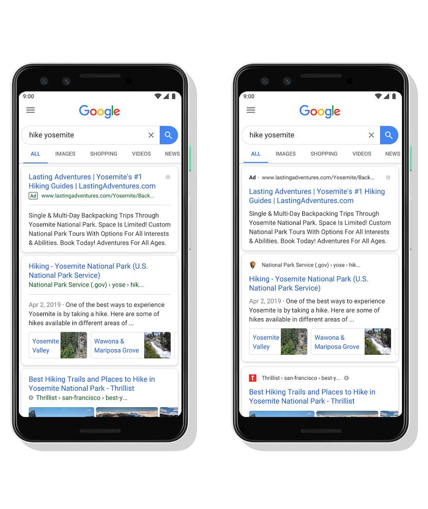 Our search results on mobile have gained a new look that presents site names and icons prominently, as well as a bolded "Ad" label for ads. The new design rolls out over the coming days. Learn more here: https://www.blog.google/products/search/new-design-google-search/ … pic.twitter.com/UN9oj2qwXT